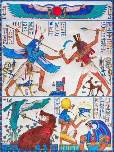 세트는 사막과 폭풍의 신, 호루스는 매의 눈을 가진 하늘의 신입니다.